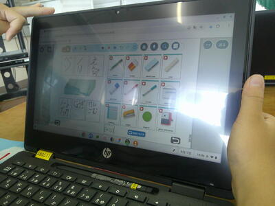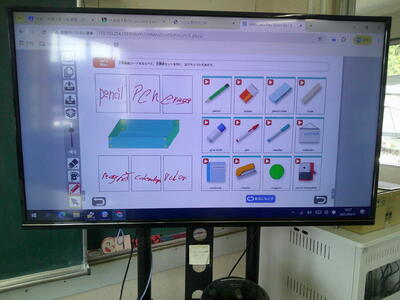 4年生が外国語活動をしていました。タブレットを活用し、さまざまなソフトを使って自分の考えを記載したり、級友と対話をしたりして、楽しい授業を展開していました。