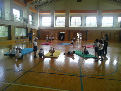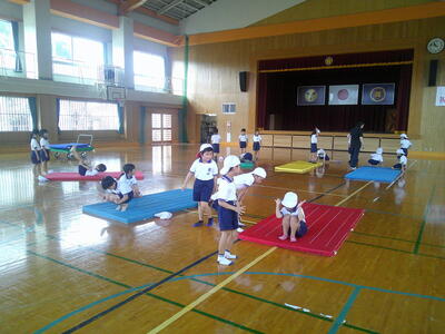 1.2年生が本日も、合同体育(マット運動)をしていました。
