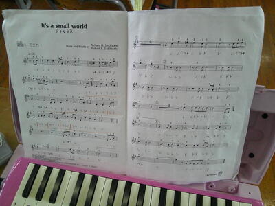 ちょうど、けんばんハーモニカで「小さな世界」を練習していました。