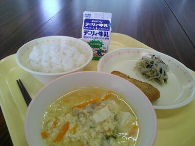 今日の給食は、「ごはん、かきたまじる、ホキフライ、ほうれんそうともやしのごまあえ」でした。