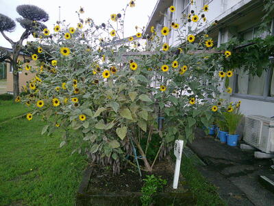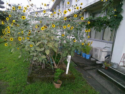今年の理科園のひまわりはすごいです。何がすごいかというと、根元の茎の大きさとヒマワリの花の数です。きっと根っ子も大きく、深く根付いていることだと思います。