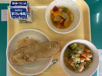 本日の給食献立➡牛乳、ポトフ、フルーツカクテル、そしてあげパン・・・子供たちに大人気だったそうです。