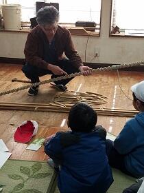 「竹を熱したり、力を入れて曲げる」と予想していた子どもたちは、くさびを打ち込んで曲線をつけていく工夫と伝統の技に驚いていました。