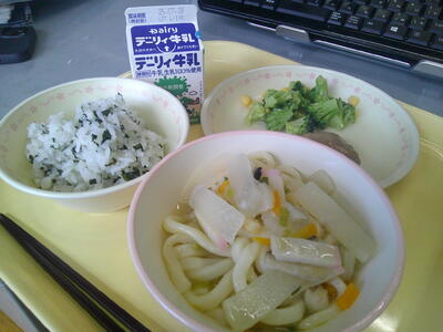 7月14日の給食は、「ごもくうどん、ひらつくね、ブロッコリーとコーンのあえもの」でした。