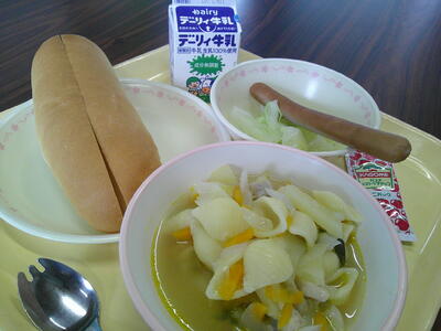 7月17日の給食は、「マカロニスープ、ホットドック」でした。