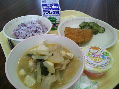 1学期最後の給食は、「ゆかりごはん、みそキムチ汁、あじチーズフライ、きゅうりのちゅうかふうみづけ、とうにゅうプリン」でした。