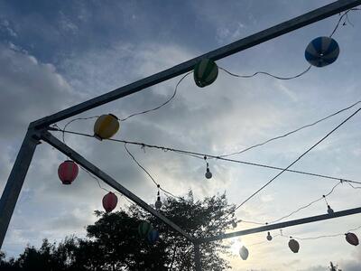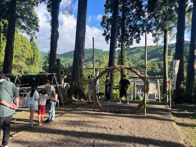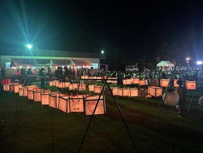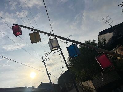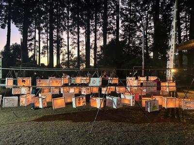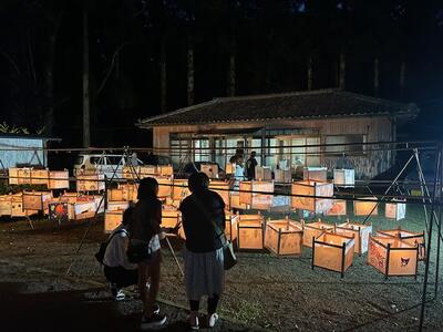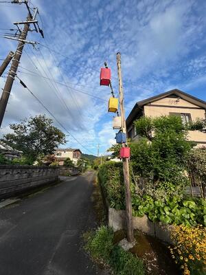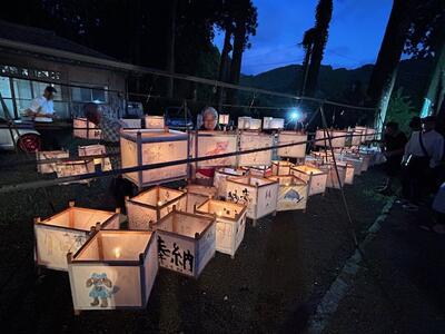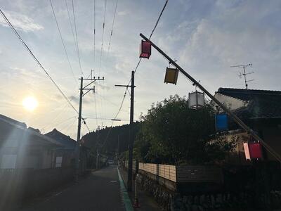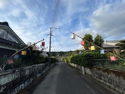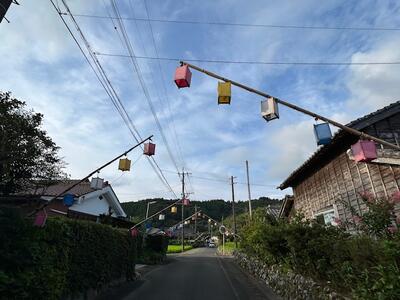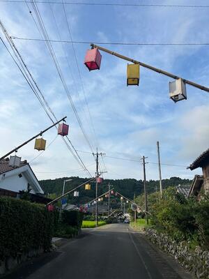 ・梶山地区では、毎年盆の時期になるとたくさんの手作り灯籠が飾られ、幻想的な風景が楽しめます。梶山地区一体となった取組で、赤、青、緑、黄色の灯籠が軒先にずらりと下げられ、通り行く人々を癒やしています。「ひとつひとつの明かりは小さいけれど、みんなの明かりを集めれば明るく、多くの人が元気になる。」「結い」の心を示しているそうです。