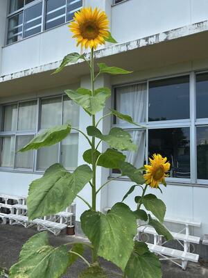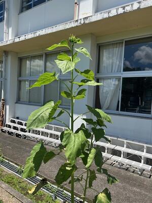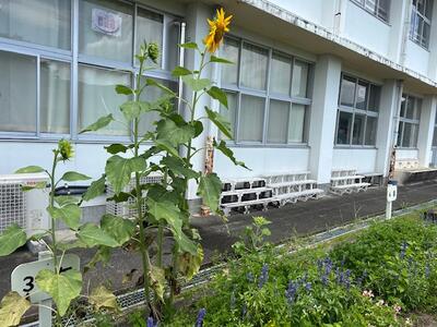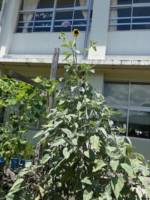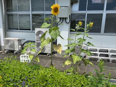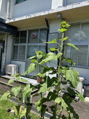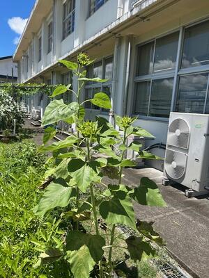 今年の理科園のひまわりはすごいです。何がすごいかというと、根元の茎の大きさとヒマワリの花の数です。きっと根っ子も大きく、深く根付いていることだと思います。