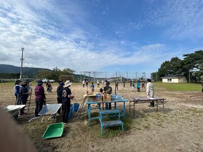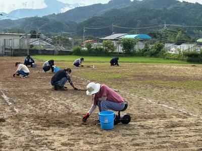 9月27日(土)に21名の保護者の方々が集まり、①駐車場や校舎内の草刈り、③運動場の整備、④掲示板のペンキ塗りを実施していただきました。