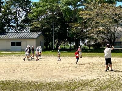 5年生は、6月に実施される、青島青少年自然の家での宿泊学習のために今回の遠足はありませんでしたが、昼休み時間に、学級の先生2人と児童全員で、ドッジボールをしていました。