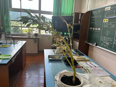 理科室では、3年生の「植物の一生」の授業が実施されていました。学習のめあては、「植物が育つようすをふりかえってまとめよう」でした。教卓には、ホウセンカが一株設置してあります。ホウセンカの花が咲いた後、ホウセンカはどのように育っているのかを観察する授業です。