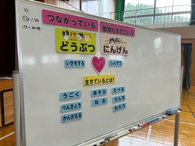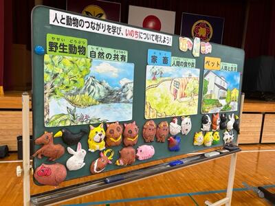 テーマは「人と動物のつながりを学び、いのちについてかんがえよう」でした。動物を「野生動物」「家畜」「ペット」に分けて、それぞれの動物の命の大切さについて教えて頂きました。
