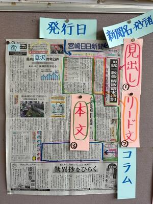 ・上写真→新聞の構成について説明しています(教室内掲示)。