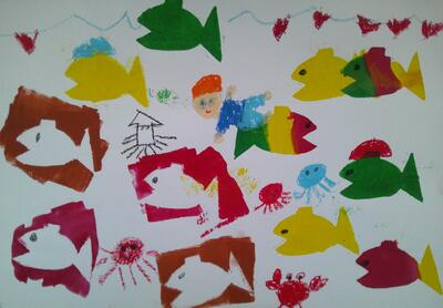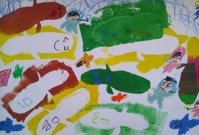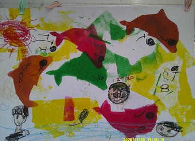 タイトルは、上から①「いるかのじゃんぷ」②「きょうりゅうのらくえん」③「海の中で魚ときょうそう」④「人間と魚とうなぎのダンスパーティー」です。