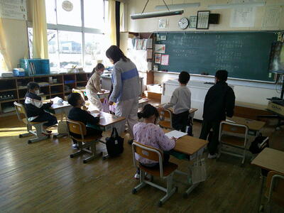 1年生が音楽主任の先生を囲んで、卒業式の歌の練習をしていました。