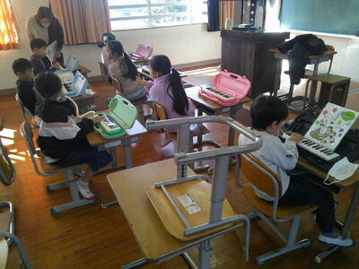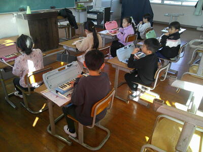 音楽室で、1年生がけんばんハーモニカの練習をしていました。