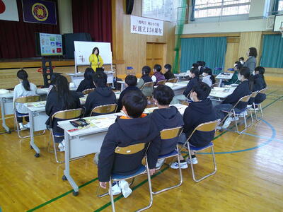 宮崎県消費者生活センターから職員の方に来ていただき、体育館で「消費生活」についての話をしていただきました(5.6年生)。