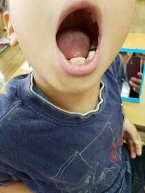 「歯と口の衛生週間」に合わせて、養護教諭が全学年に「「歯と口」についての学習をしています。1年生は王様の歯(第1大臼歯)についての勉強でした。自分の口の中に興味津々の1年生です。