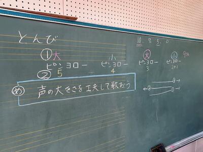 11月11日、音楽室で4年生が「とんび」の授業をしていました。「声の大きさを工夫して歌おう」が学習のめあてでした。子供たちは、とんびの歌詞の意味ををしっかりつかみながら、大きく歌うところ、そうでないところを工夫していました。