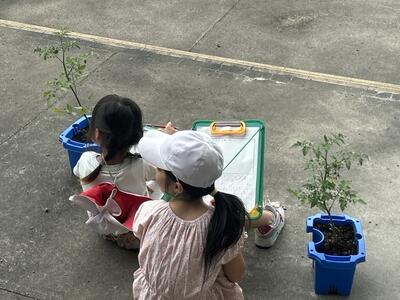 子供たちは、ミニトマトが成長している様子をとても興味深く、細かく、観察していました。観察用紙に絵と文で、しっかり記録を残していました。