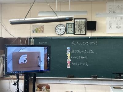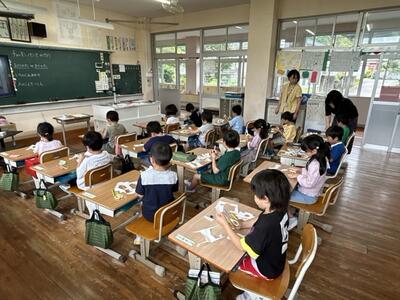 1年生が図画工作科で、紙を折ったり切ったりしてできる飾りをつくる学習をしていました。