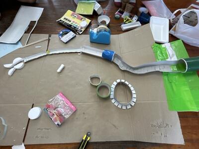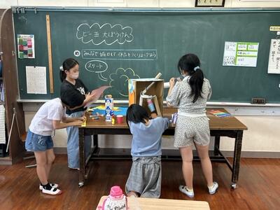 ビー玉のコースをつくる図画工作は、むかしからずっと、題材として取り上げられてきました。子供たちにとって、魅力的な題材なのだと思います。5年生児童は、コースづくりに熱中していました。