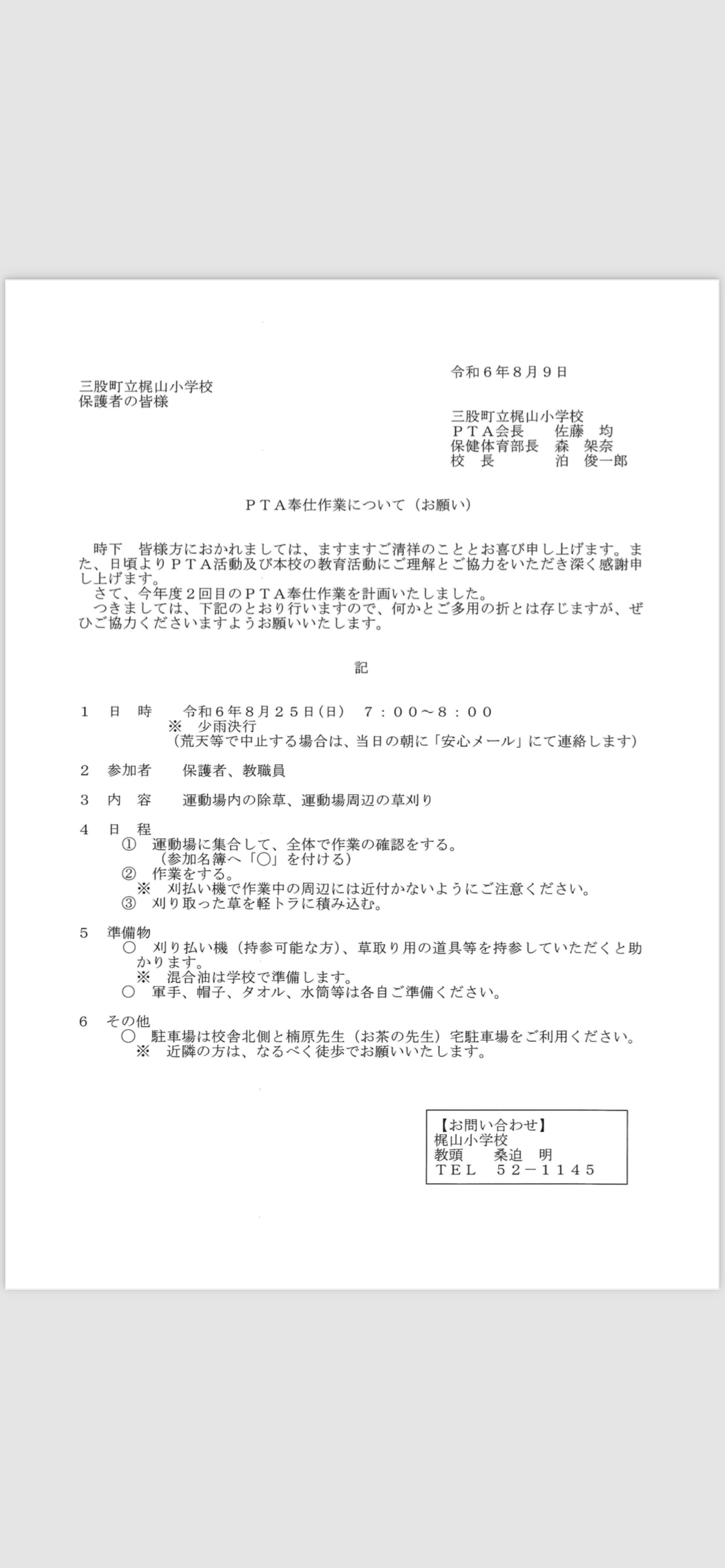 さて、明日は朝早くからの奉仕作業です。運動場や中庭、そして教室内の教育環境を、より整えたいと考えています。宜しくお願いいたします。