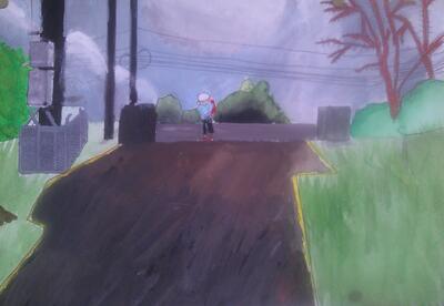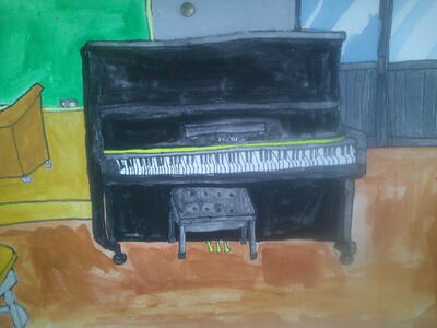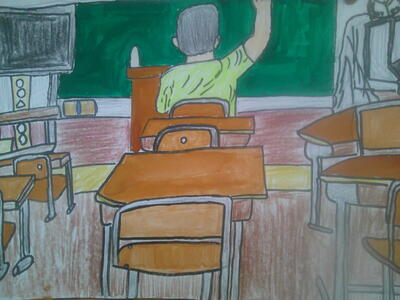 上から順番に①「音楽室」、②「音楽室」、③「算数準備室」、④「校門」の4作品(6年生教室廊下に掲示してありました)を紹介します。