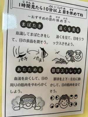 本コーナーに行くと、色々なことが学べます。「色々なものを、30cm~40cmは目を離して見なくてはいけないこと」、「1時間見たら、10分以上目を休めること」等。