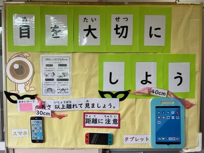 保健室に「目を大切にしよう」コーナーができています。確か10月10日は目の愛護デーだったと思います。10と10を横にすると「まゆと目」に見えるからですね。