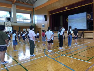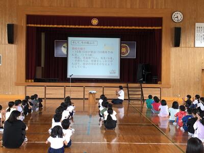 最後に、150年間続いた梶山小の歴史を振り返りながら、校歌を歌って全校集会は終了しました。