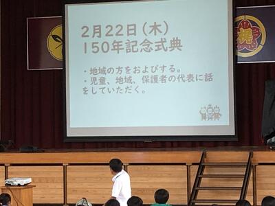 「梶山小150周年の話」を全校集会でしました。プレゼンテーションソフトを使い、①150年前の梶山小、②110年前の梶山小、③90年前の梶山小、④76年前の梶山小、⑤50年前の梶山小、⑥25年前の梶山小、⑦現在の梶山小、⑧校長先生の願い、⑨記念式典(2月22日)のことの9つの構成で話をしました。