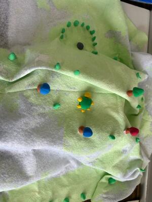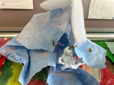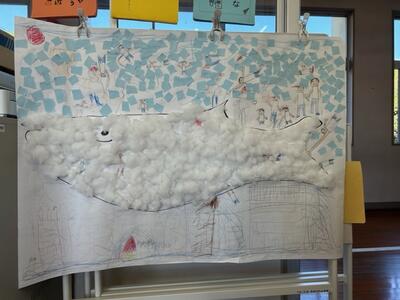 3人が作成したくじらぐもは、しろいふわふわしたわたが、たくさん使ってあり、本当に子供たちを乗せてくれそうなできばえでした。