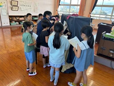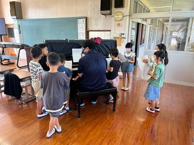 2年生の音楽の授業です。学級児童全員が、学級担任の先生とピアノを囲んで、歌を歌っていました。