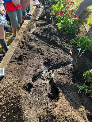 *学級花壇に縦長の勾配をつくります。そして、山から流れる川をつくり、川の水に見立て、上流から中流、中流から下流と流れる川をつくります。当然、川の水はまっすぐは流れません。蛇行しながら流れ、内側と外側の水の流れ方には差が出てきます。