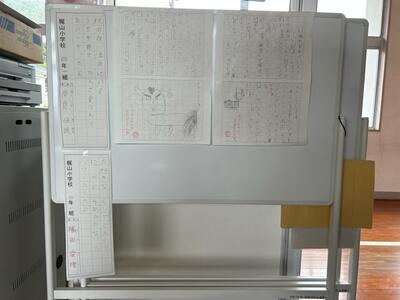 5年生教室廊下を歩いていたら、家庭科で作製したエプロンが展示してありました。子供たちは、エプロンを作製した感想を書いていました。