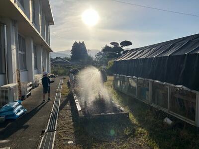 2枚目の写真は、4年生が、学級園に水をかけている写真です。きれいだなあと思い、さっとカメラを準備し、撮影しました。