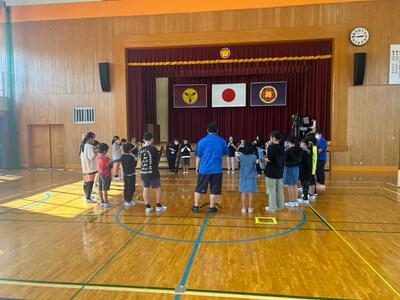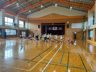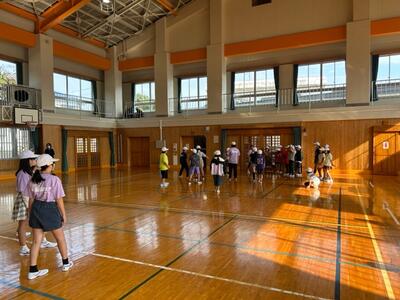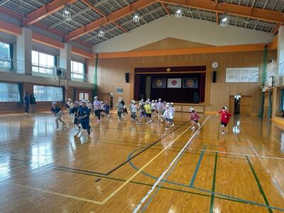 3.4.5年生は、天候等の事もあり、予定の時刻より早めに学校に到着したので、3学年で体育館にて「だるまさんがころんだ」大会を実施しました。*下の写真はその写真です。