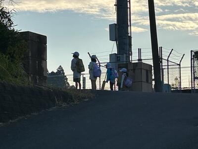 *上の写真は、本日の朝、校舎に向かって朝の元気なあいさつをする登校班の子供たちです。