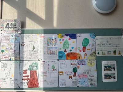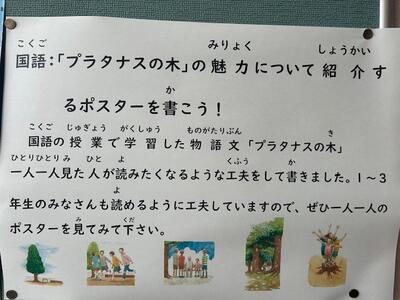 4年生は、「プラタナスの木」という物語文の学習をしてきました。合計8時間の学習ですが、まずは、6時間をかけて、登場人物や仲間の心の変化を学び、最後の2時間では、「プラタナスの木」の魅力について紹介するポスターを作成しました。