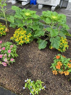 学級園のひまわりも、だいぶ大きくなってきました。花も咲き始めました。