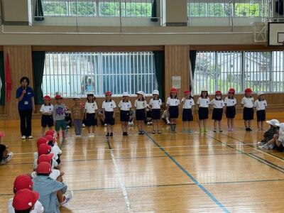まず、1年生が、自己紹介を1人ずつしていきました。みんな、堂々と自分の名前を言うことができました。自己紹介の後は全員であいさつをしました。最後の言葉「よろしくお願いします」まで、しっかりと言う事ができました。