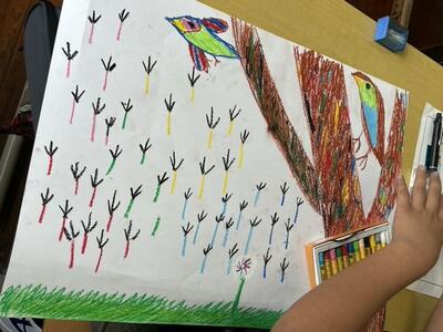 春の風や空気感が表現できるように、絵の具やペン、クレヨンの使い方を工夫していました。絵具では、「スパッタリング」「にじみ」「色の重なり」「絵の具の水の量」などの指導も行われていました。