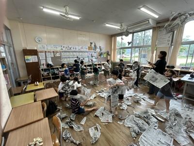 4月24日(水)、2年生図工の様子です。「しんぶんしとあそぼう」という小単元で、「かだらぜんたいを使って、新ぶんしをたのしもう」という学習のねらいをもち、体験的な授業が展開されていました。