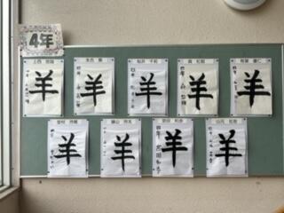 2階の学年掲示板を見ていましたら、先日紹介した、4年生の毛筆「羊」の作品と5年生の図工の作品が展示してありました。