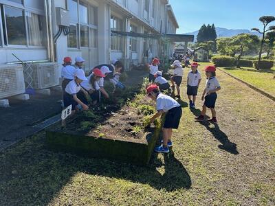 本日1時間目に、美化活動を行いました。花壇整備と運動場の草とりをみんなでがんばりました。花壇は、植えていた花を全て抜きとり、肥料を混ぜて土を耕し、石灰も蒔きました。