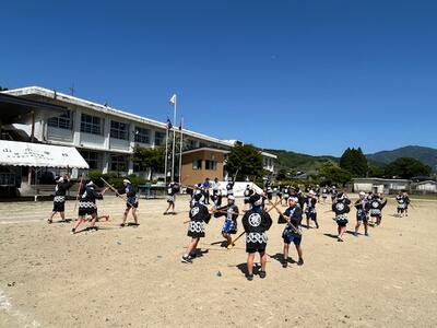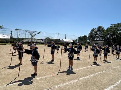 4.5.6年生が棒踊りの練習をしていました。本日初めて、棒踊りの衣装を着ての練習でした。