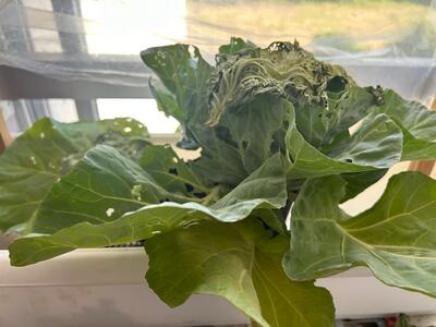 *写真は、上から①アゲハチョウが食べたみかんの葉、②アゲハチョウがさなぎとして成長しているむしかご、③モンシロチョウが食べたキャベツ、④モンシロチョウが幼虫からさなぎに成長しているビニールハウス です。