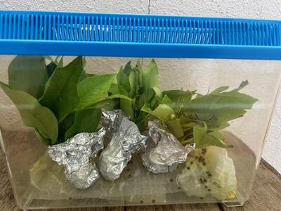 理科室で、モンシロチョウとアゲハチョウを育てています。3年生の理科学習で扱います。理科の先生に聞きますと、現在、モンシロチョウが30匹くらい、アゲハチョウも数匹、順調に成長しているようです。