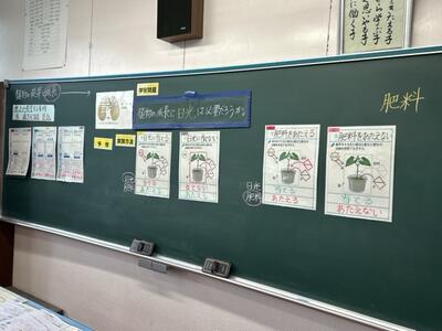 昨日、5年生が理科の授業をしていました。「植物の発芽と成長」の学習で、「植物の成長に日光は必要だろうか」という学習問題に取り組んでいました。
